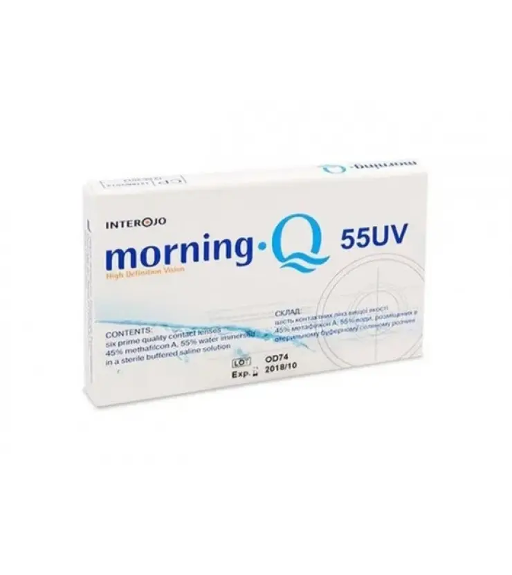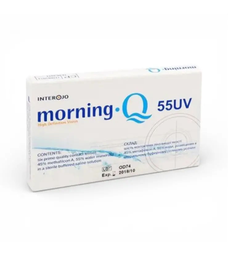 Interojo Morning Q 55UV — м’які гідрогелеві контактні лінзи щомісячної заміни для корекції короткозорості та далекозорості (- / +). Модель орієнтована на щоденний комфорт: матеріал Methafilcon A має 55% вмісту води, що підтримує зволоження протягом дня, а також забезпечує достатню еластичність і зручність у маніпуляціях.