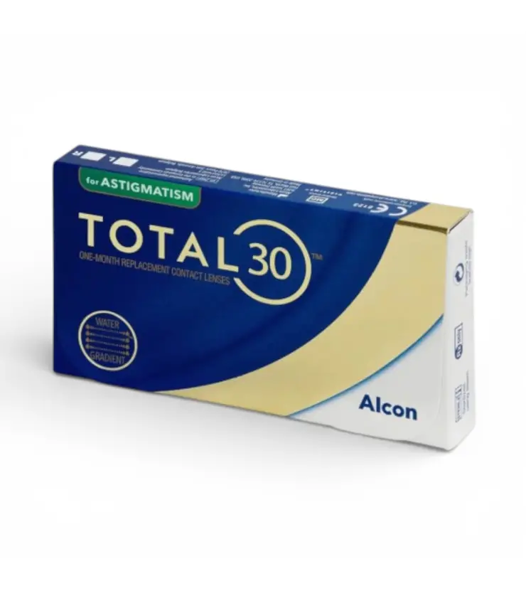 Total 30 for Astigmatism — м’які торичні контактні лінзи місячної заміни від компанії Alcon, розроблені для корекції астигматизму. Лінзи призначені для денного носіння протягом 30 днів та поєднують максимальний комфорт, стабільний зір і високий рівень захисту очей.