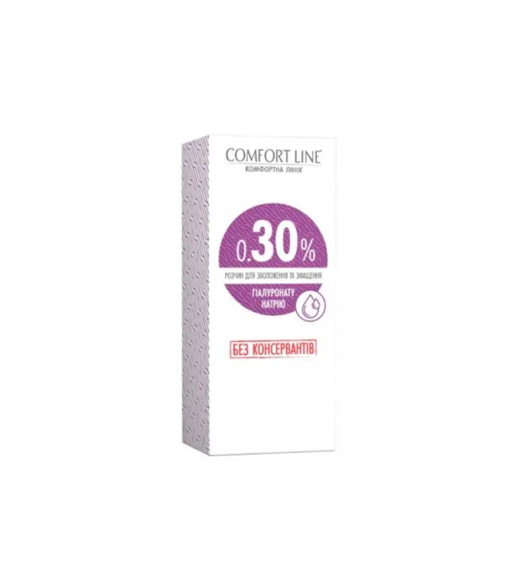Comfort Line 0.30% без консервантів — зволожуючі та змащувальні краплі з гіалуроновою кислотою 0,30% (гіалуронат натрію) для тривалого полегшення симптомів помірної та сильної сухості очей. Висока концентрація гіалуронової кислоти допомагає утримувати вологу, стабілізувати слізну плівку, зменшувати випаровування та знижувати відчуття сухості й подразнення.
