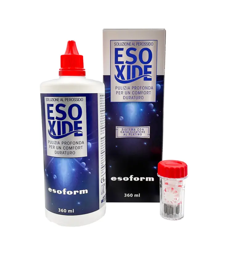 Esoform ESOXIDE — стерильний пероксидний розчин для глибокого очищення та дезінфекції контактних лінз. Активний інгредієнт — стабілізований 3% перекис водню, який ефективно знищує мікроорганізми (віруси, бактерії та грибки) і допомагає видаляти навіть сильні забруднення, з якими не завжди справляються звичайні багатофункціональні розчини. Особливо рекомендований користувачам лінз подовженого носіння для регулярного глибокого очищення.